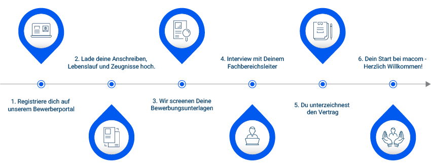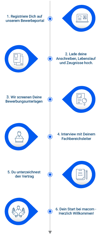 Folgende Schritte musst du für deine erfolgreiche Bewerbung absolvieren und mit etwas Glück steht deinem Start bei macom nichts mehr entgegen.